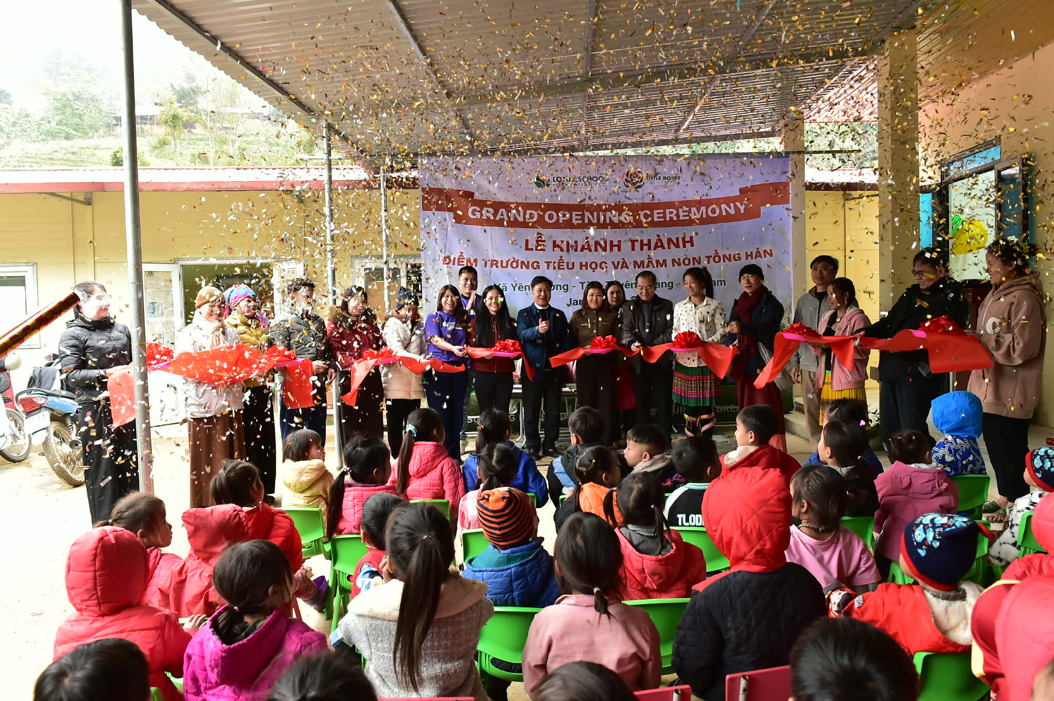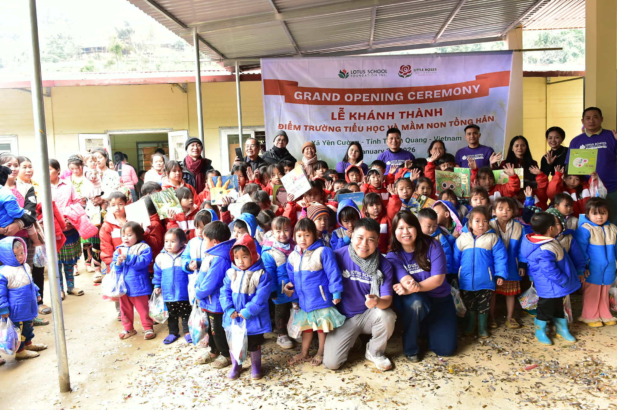 The Lotus School Foundation, together with our beloved partner, the Little Rose Foundation happily celebrated the grand opening of Tong Han Elementary School in Bac Me, Tuyen Quang (formerly Ha Giang). Nestled nearly 5,000 feet above sea level amid breathtaking yet rugged mountains, reaching this special place was a true experience, as both of our teams carefully navigated through steep, rocky trails and challenging terrain. Experiencing this journey firsthand deepened our understanding of the hardships faced by these disadvantaged communities and the immense challenges they overcome daily. This heartfelt dream became a reality thanks to the incredible generosity of donors and commitment of many kind supporters. We extend our deepest gratitude to each and every one of you for making this possible.